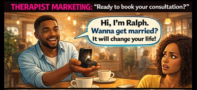 When the only thing you offer is "book a consultation," you're proposing marriage on a first date. Most people aren't ready to say yes — not because they don't need you, but because you haven't given them enough to say yes to. You need a "pipeline" that moves them step-by-step towards therapy.