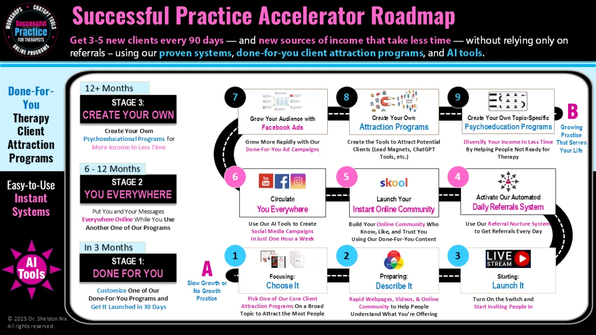 The Successful Practice Accelerator is the first practice-growing system that combines done-for-you client attraction programs (therapist-created), step-by-step growth roadmap and training, and AI tools designed specifically for psychotherapists. Plus a supportive community of therapists and experts.